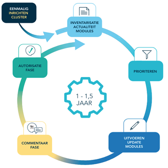 Elke 1 tot 1,5 jaar worden alle richtlijnen binnen een cluster beoordeeld op actualiteit (need–for-updatefase). Richtlijnmodules die verouderd zijn – bijvoorbeeld door nieuwe wetenschappelijke inzichten of veranderde praktijk – worden geprioriteerd voor herziening (prioriteringsfase). Gemiddeld worden er elke 1 tot 1,5 jaar vijf richtlijnmodules herzien. Het is ook mogelijk om binnen de clusters nieuwe richtlijnmodules over nieuwe onderwerpen te ontwikkelen.