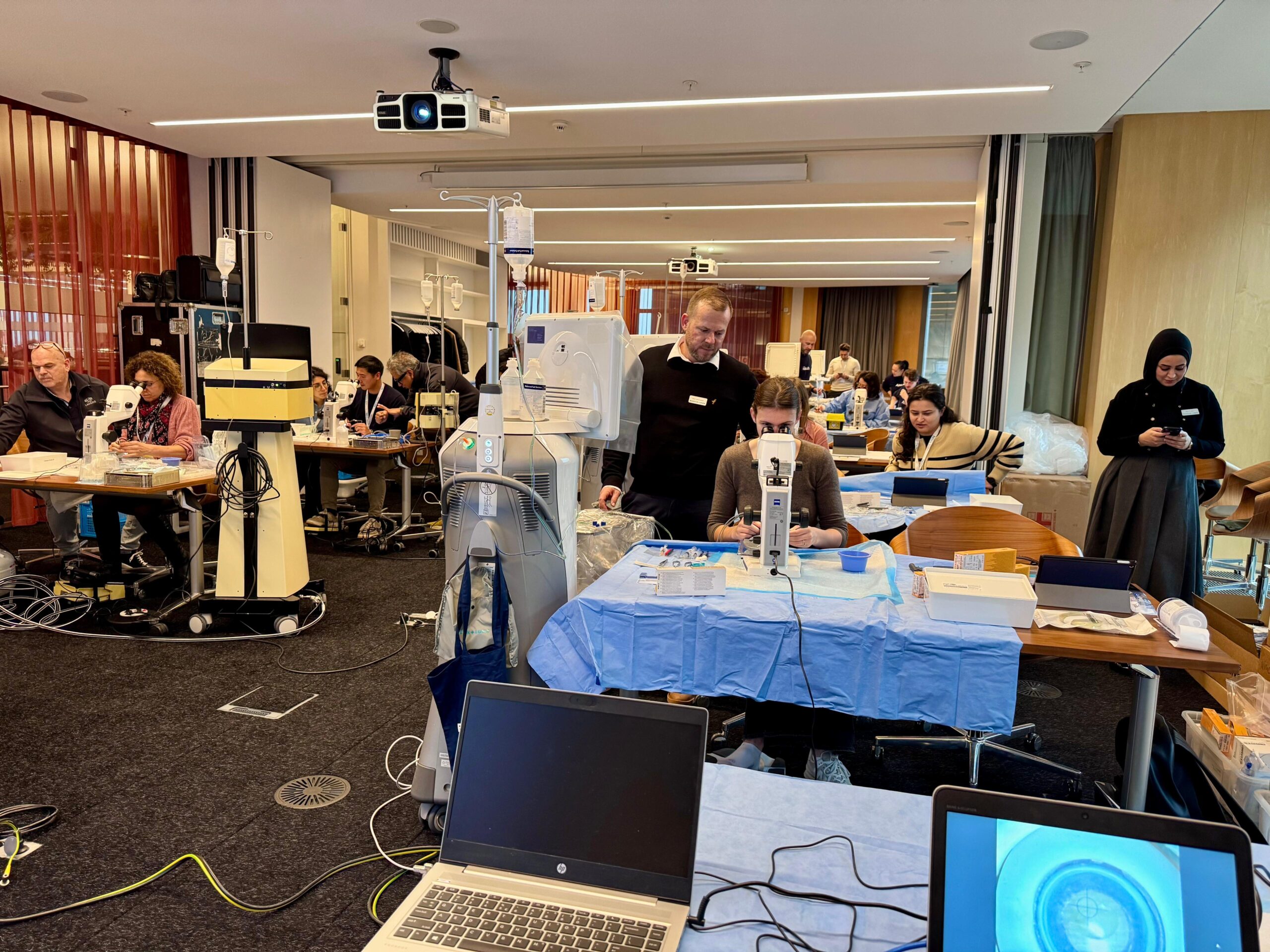 De vrijdag was geheel gewijd aan cataract-chirurgisch onderwijs voor de meer dan 80 aanwezige AIOS. Naast presentaties waren er ook uitgebreide dry- en wetlab mogelijkheden om de verschillende basis- en intermediate technieken te oefenen op kunstogen.