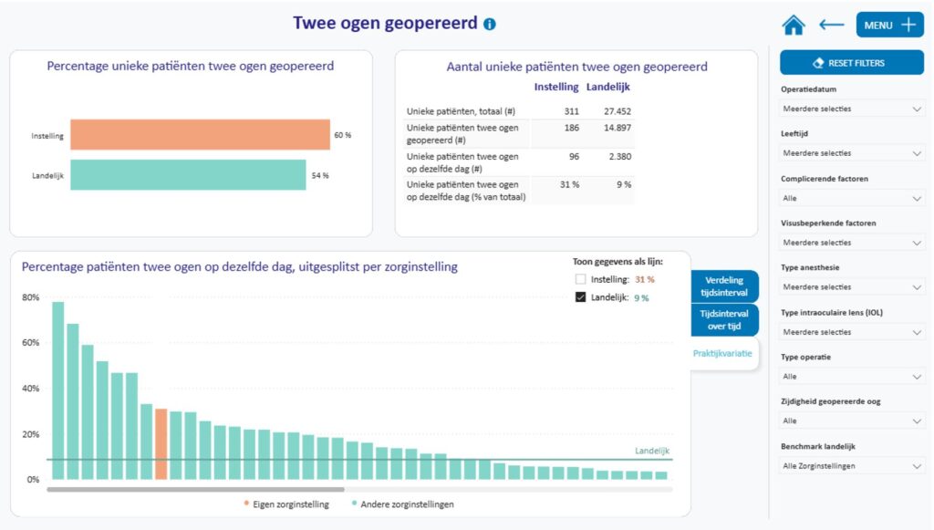 Sinds 12 november 2025 toont het dashboard van de Kwaliteitsregistratie Cataract de praktijkvariatie tussen instellingen voor de pagina’s “Twee ogen geopereerd”, “Uitkomsten – Visus en refractie” en “Uitkomsten – complicaties en heroperaties”. Hiermee krijgen instellingen beter inzicht in hun resultaten ten opzichte van andere instellingen.